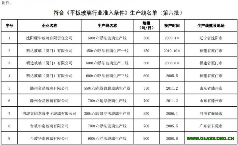 根據(jù)《平板玻璃行業(yè)準入條件》和《平板玻璃行業(yè)準入公告管理暫行辦法》,經(jīng)企業(yè)申報、省級工業(yè)和信息化主管部門核實、專家復核和網(wǎng)上公示,現(xiàn)將符合《平板玻璃行業(yè)準入條件》生產(chǎn)線名單(第六批)予以公告。