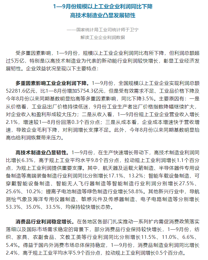【權(quán)威解讀】1—9月份規(guī)模以上工業(yè)企業(yè)利潤同比下降 高技術(shù)制造業(yè)凸顯發(fā)展韌性
