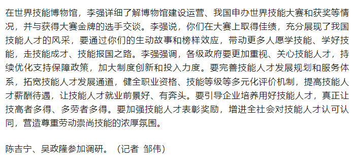 李強(qiáng)在上海調(diào)研技能人才工作時(shí)強(qiáng)調(diào) 積極適應(yīng)經(jīng)濟(jì)社會(huì)發(fā)展需要 大力加強(qiáng)職業(yè)教育和技能人才培養(yǎng)