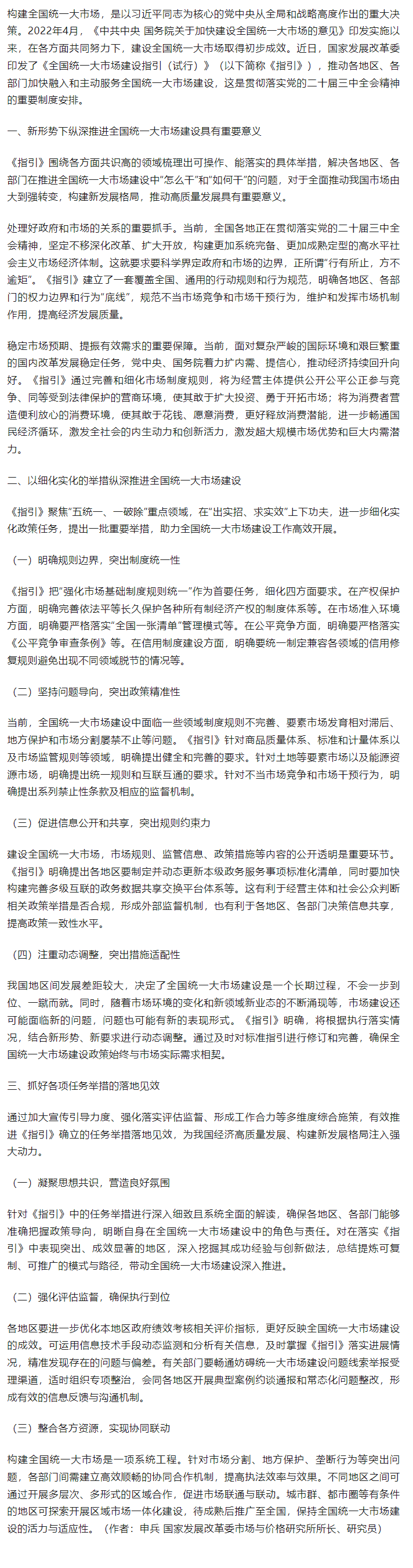 縱深推進全國統(tǒng)一大市場建設(shè)——《全國統(tǒng)一大市場建設(shè)指引(試行)》專家解讀之二