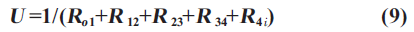 如圖1 所示,對(duì)于由兩片玻璃組成的雙層中空玻璃,總的傳熱熱阻為以下熱阻之和:玻璃表面1 與室外環(huán)境之間的對(duì)流和輻射換熱熱阻Ro1,玻璃表面2、3 之間的對(duì)流和輻射換熱熱阻R23,玻璃表面4 與室內(nèi)環(huán)境之間的對(duì)流和輻射換熱熱阻R4i ,兩片玻璃本身的導(dǎo)熱熱阻R12、R34。