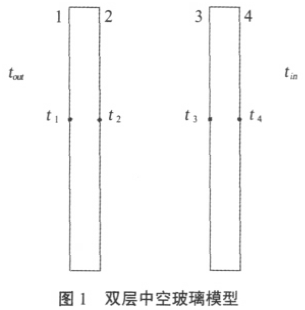 當(dāng)玻璃表面的溫度低于空氣的露點(diǎn)時(shí),在其表面就會(huì)結(jié)露。結(jié)露不僅影響著窗戶的可視性,而且容易滋生細(xì)菌,污染空氣,露水的流淌也會(huì)對(duì)房間的裝飾造成破壞。由于中空玻璃的空氣腔內(nèi)存在著可吸附水分的干燥劑,在溫度很低時(shí)其內(nèi)部也不會(huì)結(jié)露,因此,冬季中空玻璃最容易結(jié)露的表面位于室內(nèi)側(cè),即圖1中4 的位置,要減小結(jié)露現(xiàn)象的發(fā)生必須降低中空玻璃的傳熱系數(shù)以提高該表面的溫度。