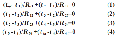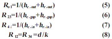 式中:tin、tout 分別為室內(nèi)、外環(huán)境的溫度;t1、t2、t3、t4分別為中空玻璃4 個(gè)表面的溫度;Ro1、R23、R4i、R12、R34 可分別由以下公式求得: