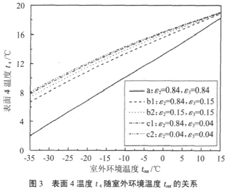 圖3 為不同ε2 和ε3 下,雙層中空玻璃表面4 溫度t 4 隨室外環(huán)境溫度tout 的關(guān)系。曲線a 表示表面2和3 均未鍍低輻射薄膜的情況,b1、c1 分別表示僅在表面3 鍍輻射率為0.15、0.04 薄膜的情況,b2 表示在表面2 和3 同時(shí)鍍輻射率為0.15 薄膜的情況,c2 表示在表面2 和3 同時(shí)鍍輻射率為0.04 薄膜的情況。從圖中可以看出,在相同的tout 下,b1、c1 與a1 相比,對(duì)應(yīng)的t4 有較大程度的提高,但是b2 與b1 相比,t4提高的程度較小,c2 和c1 相比,t4 更是相差無(wú)幾。此外,已知標(biāo)準(zhǔn)大氣壓下,室內(nèi)環(huán)境溫度tin 為20 ℃,相對(duì)濕度φ 為60%對(duì)應(yīng)的空氣露點(diǎn)為12.0℃,從圖2 可以查得,當(dāng)t4 = 12.0 ℃時(shí),a、b1、b2、c1、c2 對(duì)應(yīng)的tout 分別為-4.1、-15.8、-18.0、-19.6、-20.3℃,相同室內(nèi)條件發(fā)生結(jié)露時(shí),a、b1、b2、c1、c2 對(duì)應(yīng)的tout依次降低,但是b2 與b1 相比,c2 與c1 相比,它們的降低程度遠(yuǎn)小于b1、c1 與a1 相比所降低的程度,這也從另一方面說(shuō)明在雙層中空玻璃空氣腔一側(cè)鍍低輻射薄膜可以有效減小結(jié)露現(xiàn)象的發(fā)生,但是當(dāng)在雙層中空玻璃空氣腔其中一側(cè)表面鍍低輻射薄膜后再同時(shí)在另一側(cè)表面鍍膜,對(duì)提高其防結(jié)露性能作用較小。