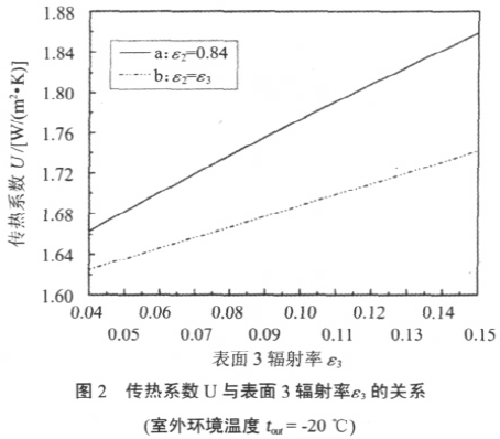 圖2 為當(dāng)室外環(huán)境溫度tout = -20 ℃時(shí),雙層中空玻璃傳熱系數(shù)U 與表面3 輻射率ε3 的關(guān)系。曲線a表示表面2 的輻射率ε2 = 0.84,即僅在表面3 鍍低輻射薄膜的情況,曲線b 表示表面2 和3 同時(shí)鍍低輻射薄膜的情況。根據(jù)計(jì)算,ε2 = ε3 = 0.84,即兩個(gè)表面都未鍍低輻射薄膜時(shí),U = 2.641W/(m2·K)。從曲線a 可以看出,對(duì)于僅在表面3 鍍低輻射薄膜的情況,當(dāng)ε3 =0.15 時(shí),U = 1.859 W/(m2·K),相對(duì)于兩個(gè)表面均未鍍膜,U 降低了0.782W/(m2·K)。隨著ε3 的減小,U 值進(jìn)一步減小,當(dāng)ε3 = 0.04 時(shí),U = 1.663 W/(m2·K),相對(duì)于兩個(gè)表面均未鍍膜,U 降低了0.978 W/(m2·K)。因此,在中空玻璃空氣腔一側(cè)鍍低輻射薄膜可以大幅度提高中空玻璃的保溫性能。另外,曲線b 和a 相比較,當(dāng)ε3 = 0.15 時(shí),兩者U 值之差為0.117 W/(m2·K),隨著ε3 的減小,兩條曲線的垂直距離逐漸減小,當(dāng)ε3 =0.04 時(shí),兩者U 值之差僅為0.038 W/(m2·K),因此,在雙層中空玻璃空氣腔中一側(cè)表面鍍低輻射薄膜后再同時(shí)在另一側(cè)表面鍍膜,對(duì)降低傳熱系數(shù)的作用較小。