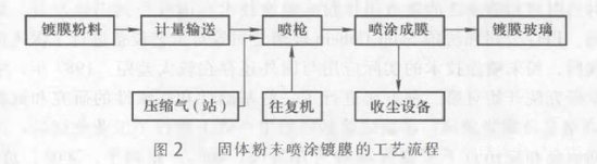 噴涂鍍膜技術(shù)是將一種或多種反應(yīng)氣體或有機金屬鹽化合物溶液的霧化顆粒或有機金屬鹽粉末噴涂于熱玻璃表面而熱分解成膜的工藝方法。固體粉末噴涂法最初是由美國Ford汽車公司于20世紀(jì)80年代初應(yīng)用于浮法生產(chǎn)線上的一種鍍膜方法,固體粉末噴涂法的工藝流程如圖2所示。