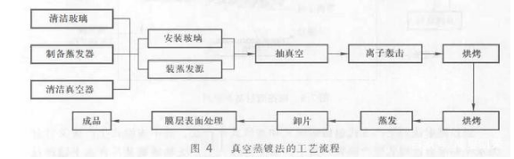 由于真空蒸鍛法的主要物理過程是通過加熱蒸發(fā)材料而產(chǎn)生,所以又稱熱蒸發(fā)法。蒸發(fā)源作為蒸發(fā)裝置的關(guān)鍵部件,大多數(shù)蒸發(fā)材料都要求在1000-2000℃的高溫下蒸發(fā)。真空蒸鍍法按蒸發(fā)源的不同可分為電阻法、電子束蒸發(fā)法、高頻感應(yīng)法和激光蒸發(fā)法等。目前,采用真空蒸鍍法生產(chǎn)鍍膜玻璃的均是采用間歇式生產(chǎn), 其工藝流程如圖4所示
