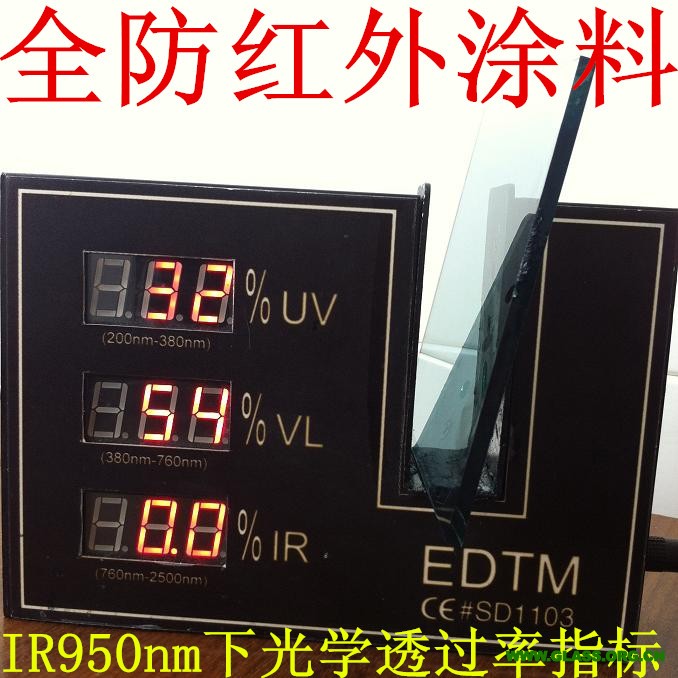 特點(diǎn):100%阻隔紅外線,熱固化。使用紅外中心波長(zhǎng)950nm和1400nm的光學(xué)透過率測(cè)量?jī)x檢測(cè),紅外線透過率均為零。 |