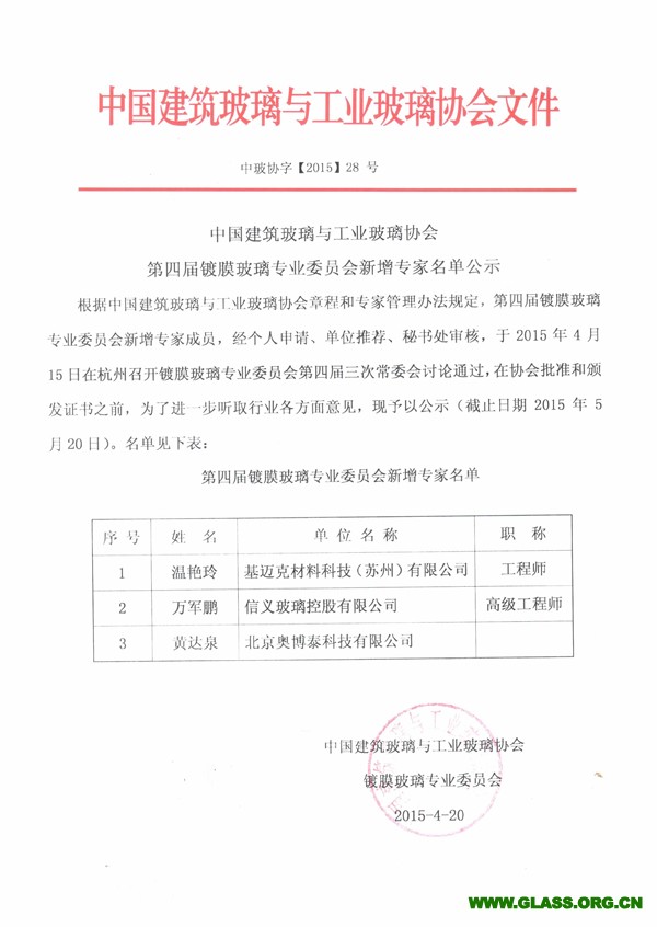 第四屆鍍膜玻璃專業(yè)委員會新增專家名單公示