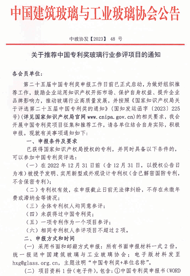關(guān)于推薦中國專利獎(jiǎng)玻璃行業(yè)參評項(xiàng)目的通知