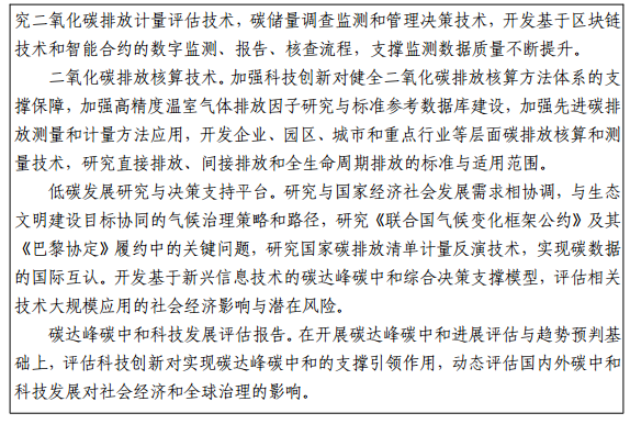 研究國家碳達峰碳中和目標與國內(nèi)經(jīng)濟社會發(fā)展相互影響和規(guī)律等重大問題。開展碳減排技術預測和評估,提出不同產(chǎn)業(yè)門類的碳達峰碳中和技術支撐體系。加強科技創(chuàng)新對碳排放監(jiān)測、計量、核查、核算、認證、評估、監(jiān)管以及碳匯的技術體系和標準體系建設的支撐保障,為國家碳達峰碳中和工作提供決策支撐。研究我國參與全球氣候治理的動態(tài)方案以及履約中的關鍵問題,支撐我國深度參與全球氣候治理及相關規(guī)則和標準制定。